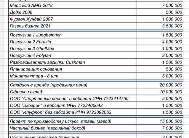 Продаю готовый бизнес (2015-2022) по импорту искусственного газона и строительства спорт. сооружений по всей России. nИмеются активы, оборот 350-500млн рубnПрибыль в год 10-15% (50-60млн руб) от оборота. nГотов продать все за 150млн и готов на переговоры детально. nnПричина продажи: переезд зарубеж. nnЕсли есть желающие, то продаю всю компанию вместе с проектом на завод за 150млнnnПосле выкупа, кладёте на счёт 200млн, то Фонд Развития Промышленности выделяет субсидию 160млн для закупки станков для завода. Станки готовы в Германии и Китае. Контракты подписаны. nnСостав сотрудников: 15 чел. nКомпания приносит 30-50млн в годnЗавод принесёт 100-200млн в годnРегиональные продажи, прямые тендеры, экспорт товара, строительство спорт. сооружения и спорт инвентарь выйдет от 1,5-3 млрд выручки за период 2023-24 гарантированно. nnСм. приложение.n