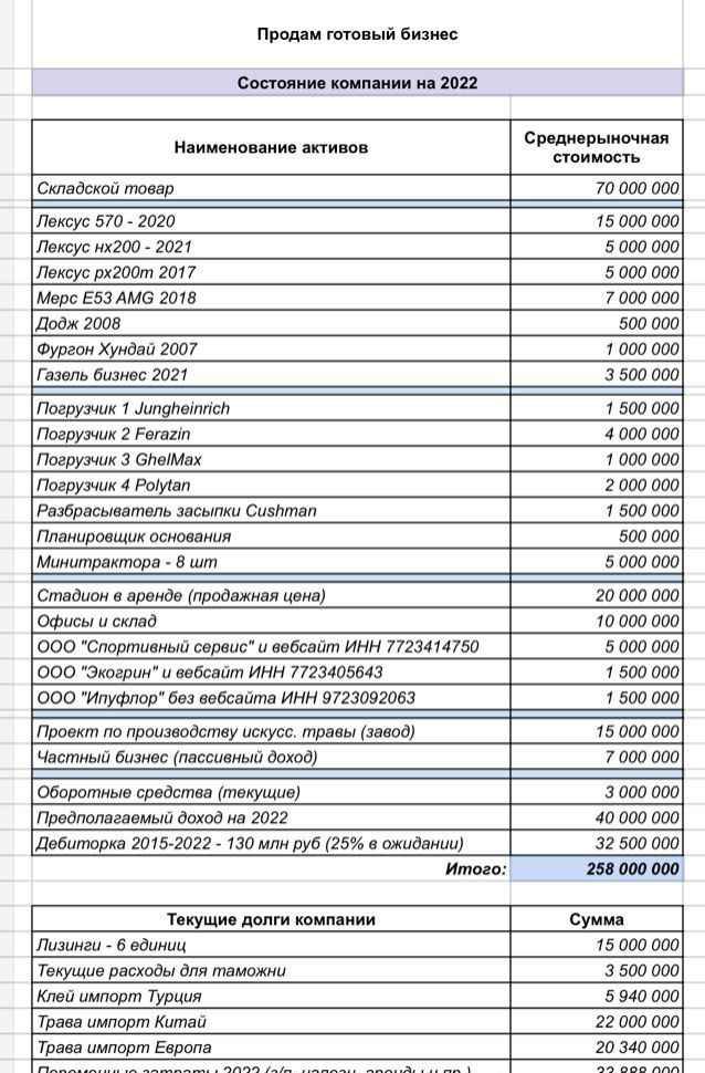 Продаю готовый бизнес (2015-2022) по импорту искусственного газона и строительства спорт. сооружений по всей России. nИмеются активы, оборот 350-500млн рубnПрибыль в год 10-15% (50-60млн руб) от оборота. nГотов продать все за 150млн и готов на переговоры детально. nnПричина продажи: переезд зарубеж. nnЕсли есть желающие, то продаю всю компанию вместе с проектом на завод за 150млнnnПосле выкупа, кладёте на счёт 200млн, то Фонд Развития Промышленности выделяет субсидию 160млн для закупки станков для завода. Станки готовы в Германии и Китае. Контракты подписаны. nnСостав сотрудников: 15 чел. nКомпания приносит 30-50млн в годnЗавод принесёт 100-200млн в годnРегиональные продажи, прямые тендеры, экспорт товара, строительство спорт. сооружения и спорт инвентарь выйдет от 1,5-3 млрд выручки за период 2023-24 гарантированно. nnСм. приложение.n