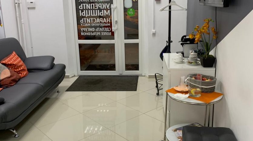 Зона ресепшен, 2 раздевалки, с/у, душевая, стиральная машина, сушильный автомат, кофе-автомат, кулер, охрана, ТV.