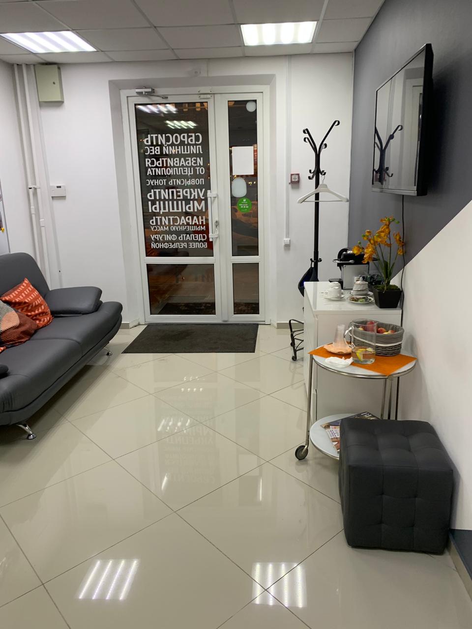 Зона ресепшен, 2 раздевалки, с/у, душевая, стиральная машина, сушильный автомат, кофе-автомат, кулер, охрана, ТV.