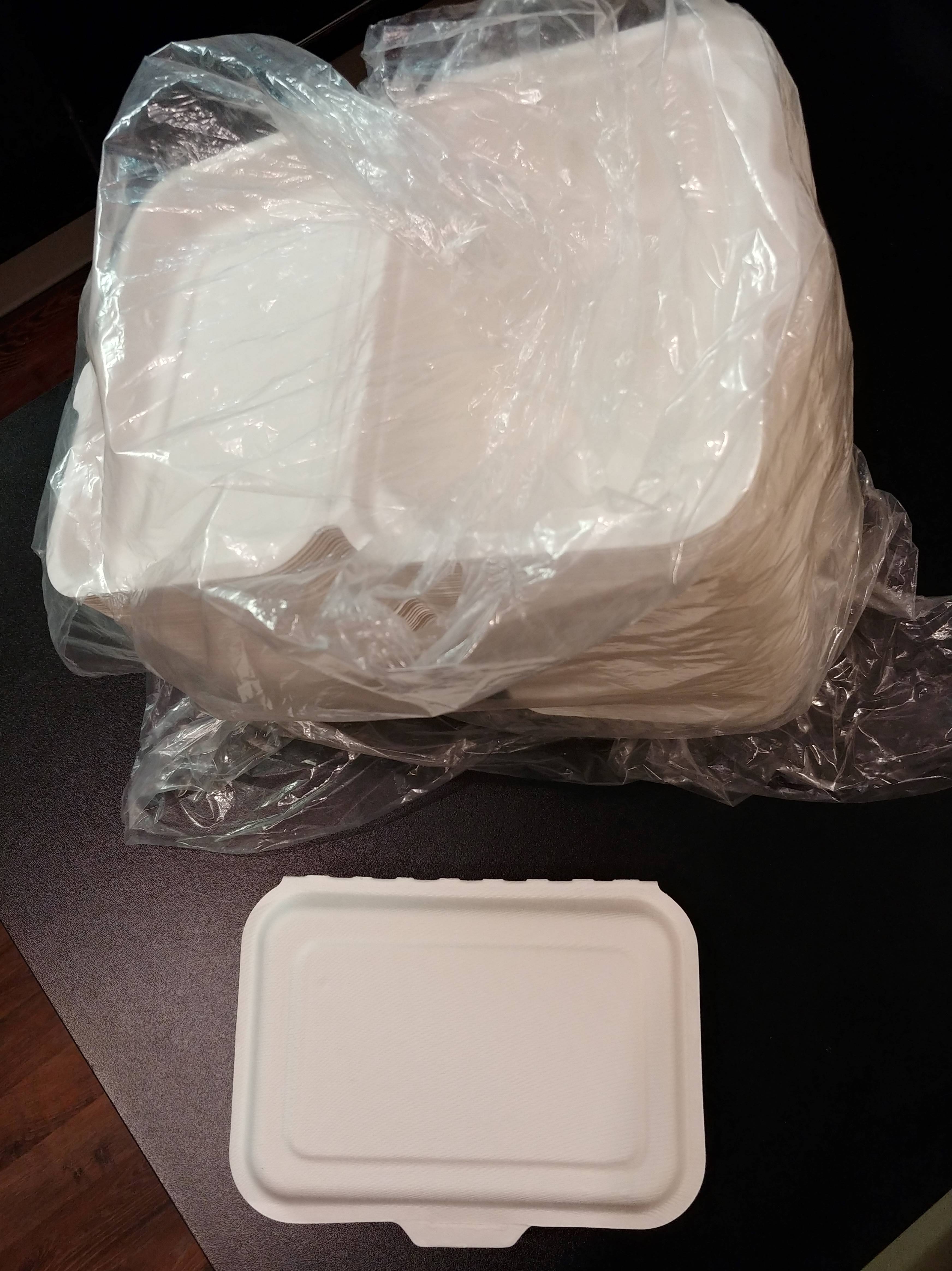 9. Небольшой запас био одноразовой посуды из сахарного тростника и кукуруз. крахмала: контейнеры, супницы и салатники