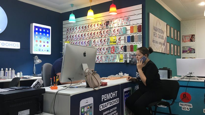 — Товарный остаток (витрина с аксессуарами и стеклами к большинству моделей смартфонов, ящик с новыми деталями)