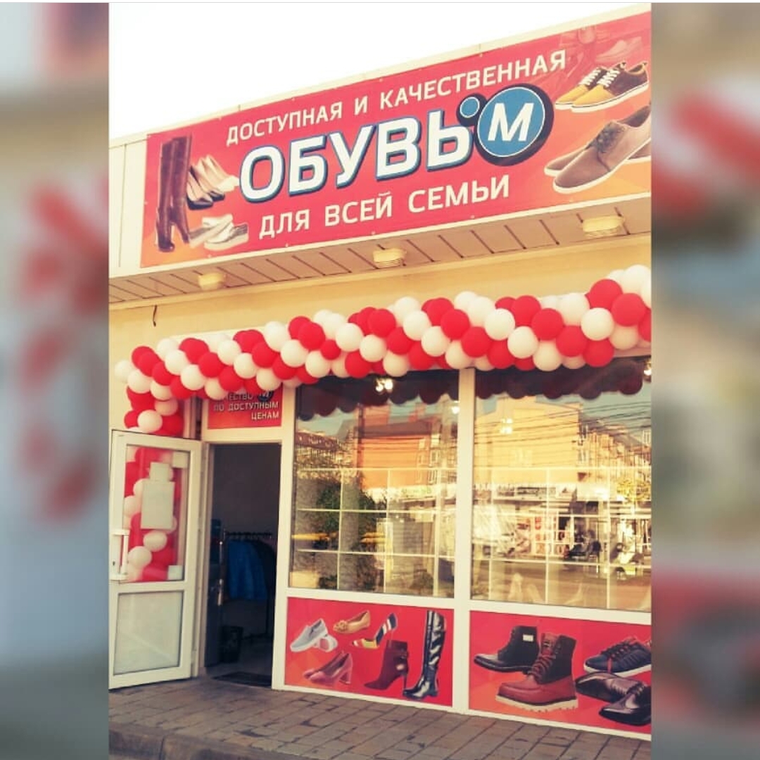 Над магазином расположена большая вывеска с названием магазина «Обувь-М» и большие витринные окна, привлекающие потенциальных покупателей.