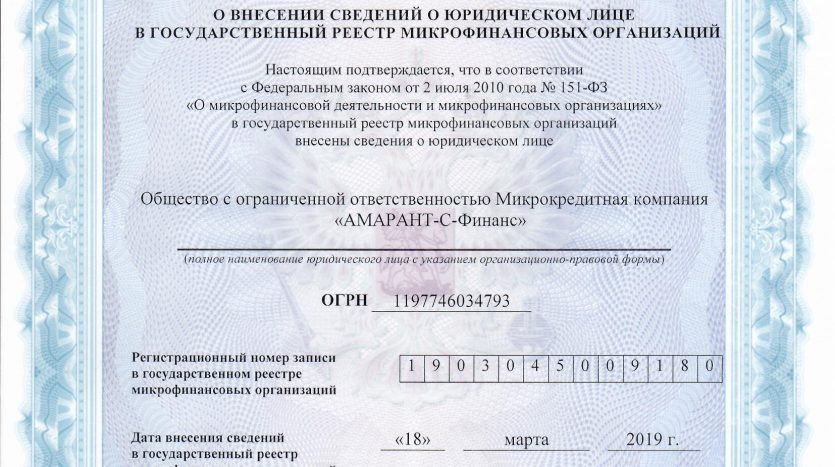 Свидетельство о внесении в реестр МФО ЦБ РФ от 18 марта 2019 г №1903045009180