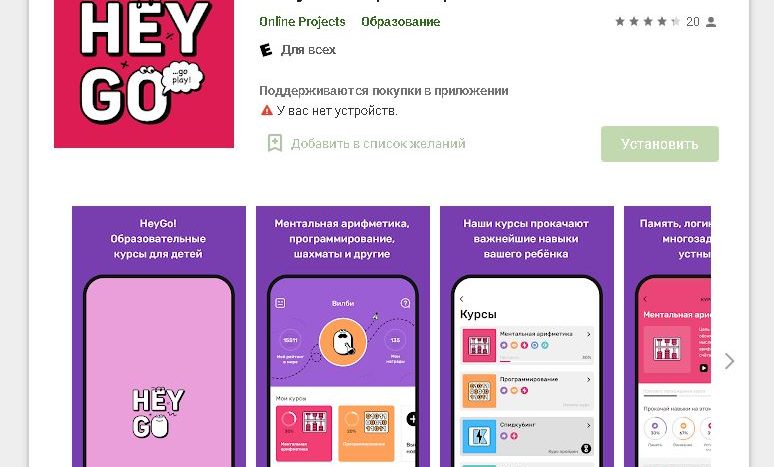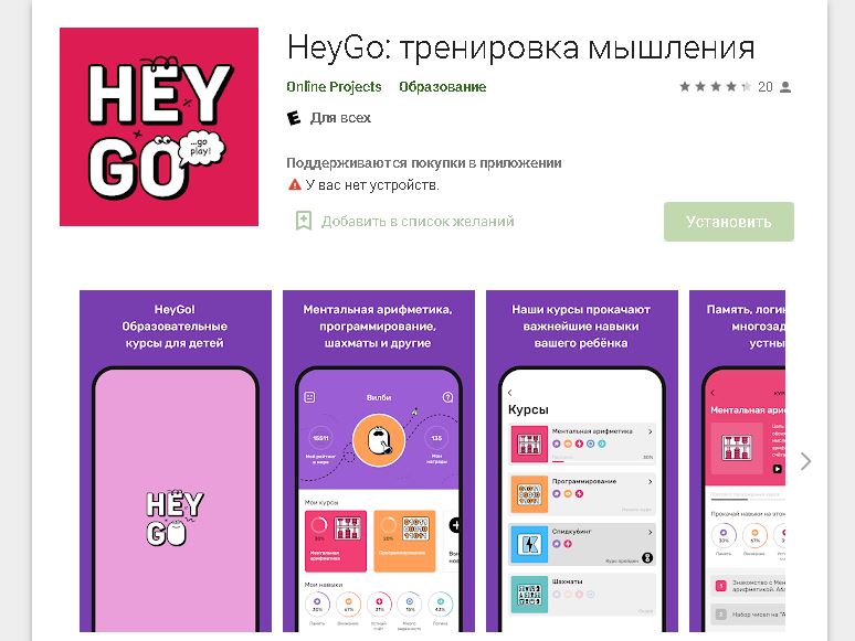 Продаётся мобильное приложение HeyGo для развития мышления детей и подростков. Приложение работает в Apple Store и Google Play. В среднем 2-3 установки в день, около 500 постоянных пользователя, доход минимум 20$ в месяц — без рекламы. Есть возможность системы больше монетизировать, добавлять новые курсы и игры, а также перевести на другие языки.