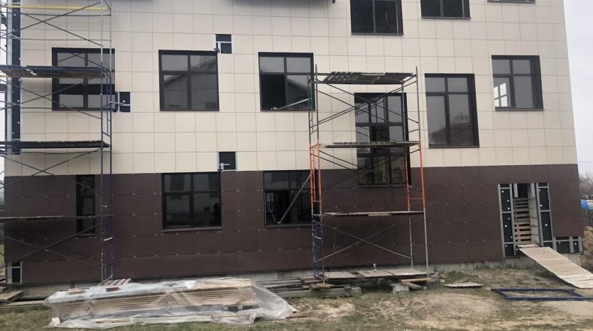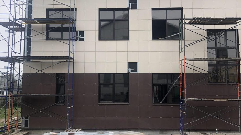 Вентилируемый фасад выполнен плиткой `Керамогранит`. Крыша здания- стропильная система сложной формы. Кровля- металлочерепица.