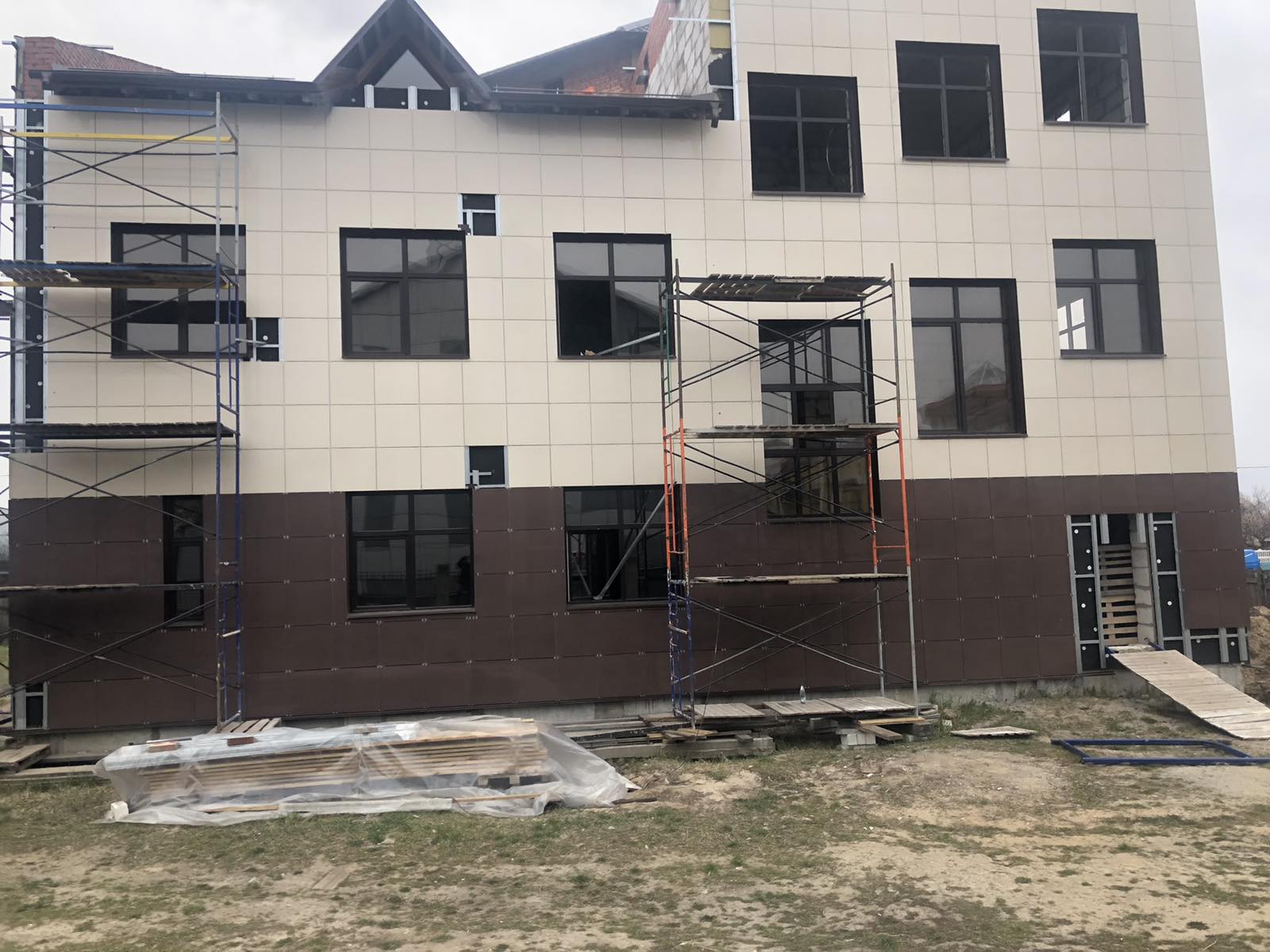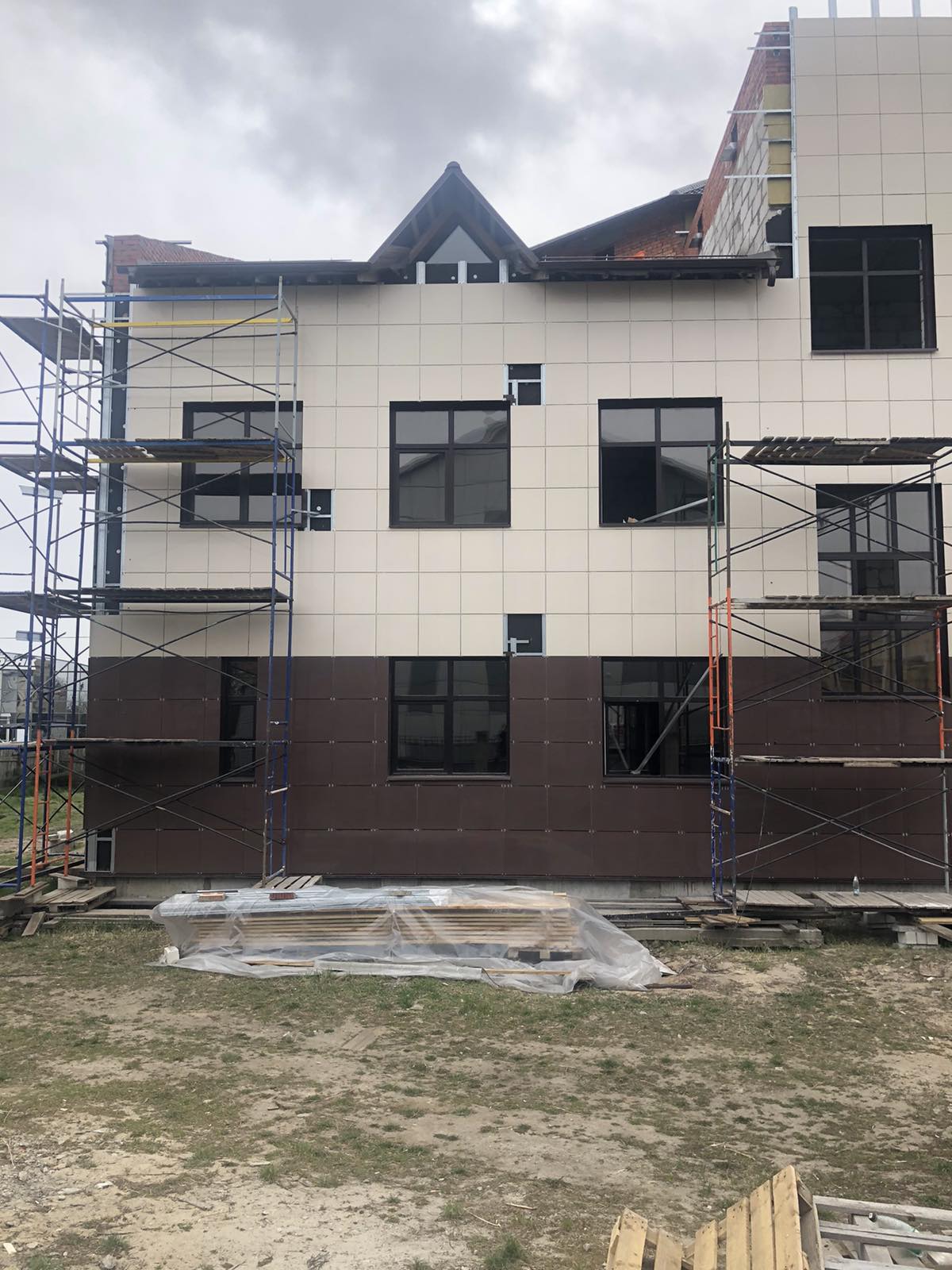 Вентилируемый фасад выполнен плиткой `Керамогранит`. Крыша здания- стропильная система сложной формы. Кровля- металлочерепица.