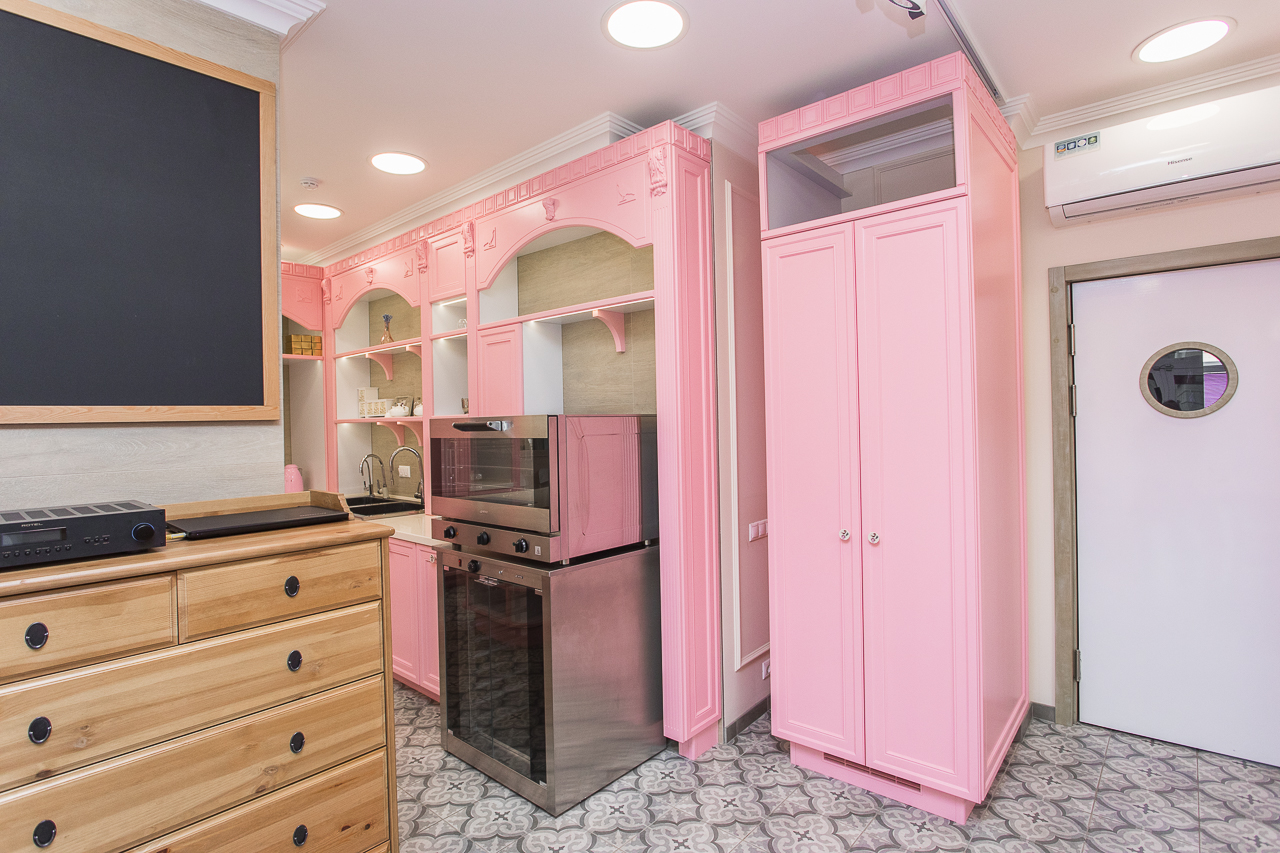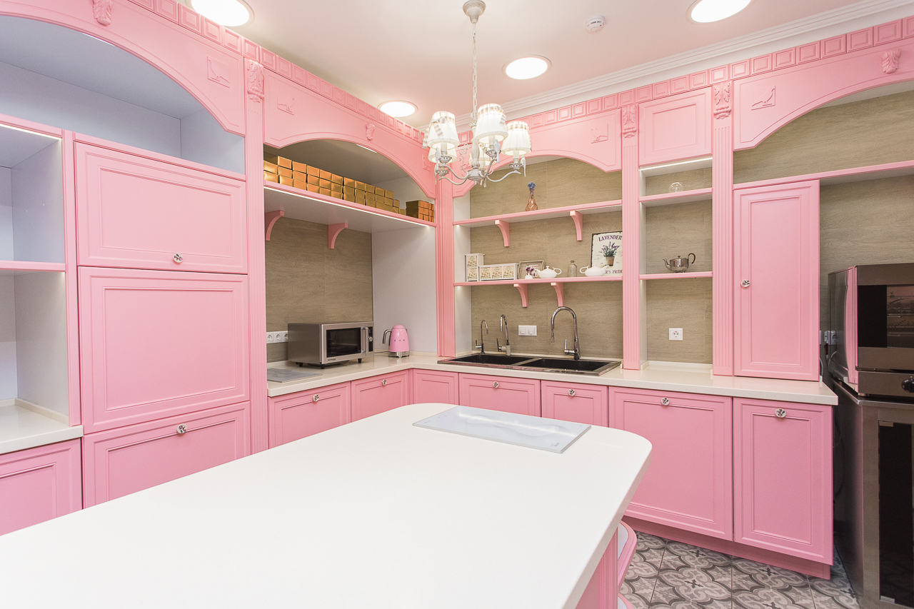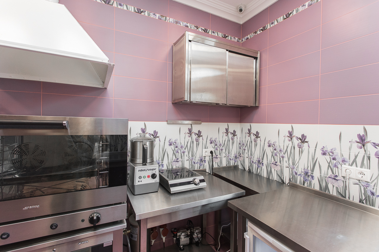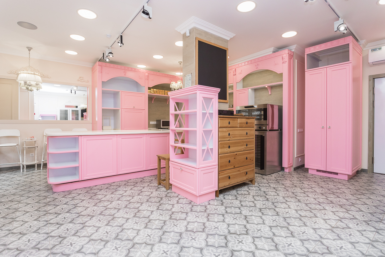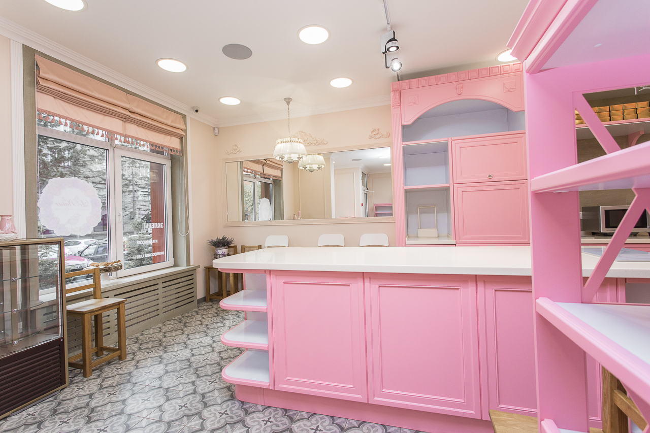 В России есть только одна Кондитерская Студия с профессиональным дизайном в стиле классической Французской Кондитерской. Здесь высококлассная дубовая мебель в благородном розовом цвете; итальянская плитка; авторские шторы, профессиональное освещение и музыкальная система.