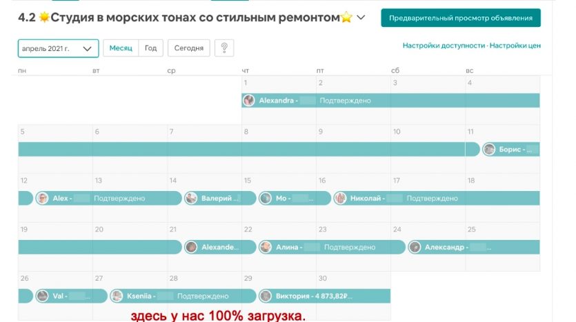При действующем рынке, средняя загрузка объекта 25 дней, это почти полная загрузка (смотрите фото расписания).