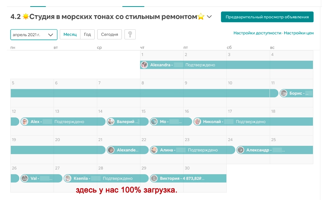 При действующем рынке, средняя загрузка объекта 25 дней, это почти полная загрузка (смотрите фото расписания).