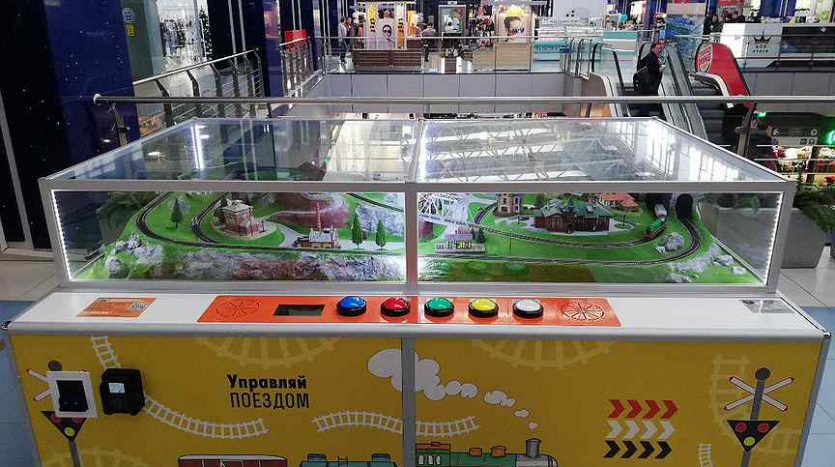 Предлагаю вендинговый игровой интерактивный макет железной дороги. Макет ручной работы с мостами, тоннелями, домами и дорогами. Суть предельна проста, ребёнок опускает в купюроприемник 100₽ и макет оживает с помощью пульта. На пульте 5 обозначенных кнопок, можно запустить и остановить поезд, подать звуковой сигнал, включить и выключить свет во всех зданиях макета, срубить и повалить дерево, запустить мельницу, и все это сопровождается соответствующими звуковыми эффектами, а самое интересное то, что на носу поезда установлена камера, которая в режиме online транслирует изображение на экран рядом с пультом управления, и в конце абсолютно каждой игры ребёнок получает подарок в виде капсулы внутри которой спрятана яркая, современная, интересная игрушка. Макет находится в проходимом месте ТРЦ «РИО» на 1 этаже.