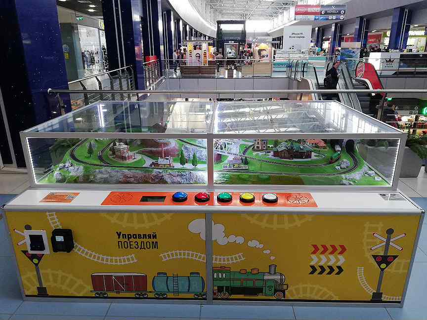 Предлагаю вендинговый игровой интерактивный макет железной дороги. Макет ручной работы с мостами, тоннелями, домами и дорогами. Суть предельна проста, ребёнок опускает в купюроприемник 100₽ и макет оживает с помощью пульта. На пульте 5 обозначенных кнопок, можно запустить и остановить поезд, подать звуковой сигнал, включить и выключить свет во всех зданиях макета, срубить и повалить дерево, запустить мельницу, и все это сопровождается соответствующими звуковыми эффектами, а самое интересное то, что на носу поезда установлена камера, которая в режиме online транслирует изображение на экран рядом с пультом управления, и в конце абсолютно каждой игры ребёнок получает подарок в виде капсулы внутри которой спрятана яркая, современная, интересная игрушка. Макет находится в проходимом месте ТРЦ «РИО» на 1 этаже.